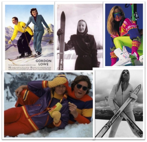 Clockwise from top left: ski fashions from the 1930s (from Found in Mom’s Basement), 1940s (from The Vintage Traveler), 1980s (from Sun Valley Guide), 1960s (from Poppygal), 1970s (from Skiwearbrands.com)